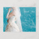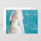 "Danke" mit diesem eleganten blau-weißen Design. Mit einer Braut in einem weißen Kleid vor einem verzierten Blumenhintergrund.