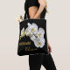 Brautmädchen und Brautparty Geschenktaschen. Realistisches, weißes Orchideendesign auf beiden Seiten eines hochwertigen, schwarzen Totensacks. Personalisieren Sie mit ihrem Namen und ihrem Titel (Brautjungfrau, Trauzeugin, Junior-Brautjungfrau oder Blume) in goldgelber Schrift und moderner Druckschrift. Auf der anderen Seite, fügen Sie ihr Monogramm Initial. Stellen Sie sicher, dass Sie beide Seiten anpassen.