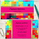 Eine farbenfrohe abstrakte Visitenkarte mit karierten Mustern, festlichen Konfetti und auffälligen Texthintergründen.
