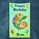 Dieses Stoffbanner ist blau und grün mit einer leuchtend bunten Fantasie lächelnden Eidechse in Orange, Gelb, Blau und Grün mit einem Stock mit einem Blatt umgeben von festlichen Ballons mit Bändern. Passen Sie den Geburtstagstext und Ihren Namen mit den Vorlagen an.