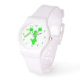 Stilvolle Cheerleader-Armbanduhr mit der hellgrünen Silhouette eines Springhirten vor weißem Hintergrund. Grüne Zahlen und Punkte, die die Stunden darstellen, und ein benutzerdefinierter grüner Text, der mit dem Namen Ihres Lieblings-Cheerleader personalisiert werden kann. Macht eine tolle Geschenkidee.