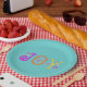 Helle und fröhliche Briefe zeigen J. O. Aquamarinen Hintergrund für einen lichtdurchfluteten Sommerplatte, der für alle Ihre Feiern hervorragend geeignet ist.