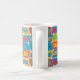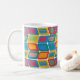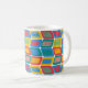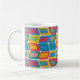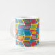Cette tasse présente un design moderne du milieu du siècle de couleurs vives qui font des rectangles arrondis avec d'autres rectangles à l'intérieur formés par une collection de lignes.