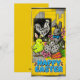 Bright retro card celebrating Easter with a cheerful chick, geometric stone rabbit, speckled eggs, carrots and blossoms on a bold yellow background .