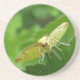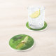 Dieser hübsche Sandstein-Untersetzer zeigt ein detailliertes Makrofoto einer kleinen, gelbfarbenen Motte mit braunen Markierungen auf einem Pollyhockblatt. Auf dem Foto sehen Sie die Unterseite der Mottenflügel, das Fell auf dem Rücken, seine blassenden Augen und seine braunen und weißen Beine. Sie können auch sehen, dass es seine fütternd Röhre entfressen hat, um zu testen, ob das Hollyhockblatt Futter ist oder nicht.