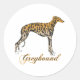 Roter Windhund mit dem Text "Greyhound" auf kleinen, runden Aufklebern.