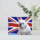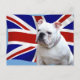 Das Bild zeigt ein Foto eines weißen englischen Bulldoggen vor einer britischen Flagge.