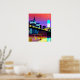 Poster in einem digitalen Bild der Skyline von New York City, mit der Brooklyn Bridge bei Einbruch der Dunkelheit in lebhaften Blautönen und tiefgründigem Fuchsienrosa