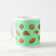 Tasse mit dem netten Brot, das Entwurf zeichnet. Hellgrüner Hintergrund. Diese Kaffee-Tasse mit 17 verschiedenen ursprünglichen Brot- und Gebäckzeichnungen erhellt Ihren Morgen und Nachmittag. Macht ein großes Geschenk für selbst oder andere für jede mögliche Gelegenheit.