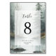 Complétez votre décoration de réception avec la beauté naturelle de la carte de numéro de table Forêt Rustique | Brume Éternelle. Ce design présente une forêt atmosphérique et mystérieuse peinte à l'aquarelle dans des tons de vert émeraude et de sauge, évoquant la sensation de sérénité d'une matinée brumeuse en forêt. Chaque carte est encadrée de silhouettes de pins éthérées, créant un look "rustique moderne" sophistiqué qui guide vos invités à leur place avec style.
