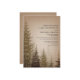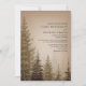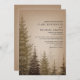 Faire-part de mariage rustique avec une illustration au fond d'arbres à feuillage persistant sur un arrière - plan brun.