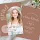 Cette invitation à la fête de graduation marron neutre et chic et personnalisable comporte le mot "grad" en gras typographie serif vintage sur le devant de l'arrière - plan en clair, beige pastel brun, ainsi qu'une photo en arc du diplômé que vous pouvez remplacer par votre propre. Le troisième en bas de l'avant est une superposition partiellement transparente en forme d'arc qui comprend un nom personnalisable, le nom de l'école, et l'année de classe dans l'écriture populaire et la typographie sans serif. Le verso de l'invitation inclut tous les détails personnalisables de la partie dans les polices sans serif et script.