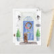 Mit unserer stilvollen Ankündigung kündigen Sie Ihre neue Adresse mit einem braunen Cockapoo, blauen Eingangstüren, Begrüßungsmatte, Schiefer-Schild, Topiaries und einem blumengeschmückten Set auf grauem Backstein an.