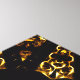 Spezieller Leinenprint mit goldener Mandala vor dunkelbraunem Hintergrund.
