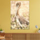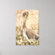 Ein nah-up Schuss zeigt ein kalifornisches braunes Pelikan mit seinem charakteristischen langen Schnabel und braunen Abfall. Der Kopf des Vogels wird leicht zur Seite gedreht und zeigt das Auge und die Struktur seiner Federn. Der Hintergrund ist verschwommen, was einen weichen, fokussieren Effekt mit gedämpften Brauntönen und Grüntönen erzeugt. Die Stimmung ist insgesamt ruhig und natürlich, was die Schönheit des Pelikans in seiner Umgebung unterstreicht.