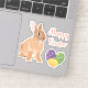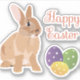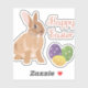 Ein niedliches braunes Kaninchen mit Ostereiern. Im Text steht "Happy Oaster".