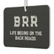 Behalt deinen LKW oder dein Auto mit diesem BRR Logo-Luftkühler frisch riechen. Rückfahrten in grauer Schrift und schwarzem Hintergrund. "Das Leben beginnt auf den Hinterwegen" Slogan in grauer Schrift.