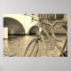 Monochrome Aufnahme eines verlassenen Fahrrads in der Nähe eines Kanals auf der Potterierei in Brügge. Das ist ein Originalfoto von Paul Cook