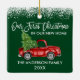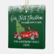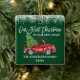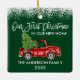 Modern Brush Script Unsere ersten Weihnachten in unserem New Zuhause Ornament beinhaltet Watercolor Vintag Red Truck mit Weihnachtsbaum. Grüner Waldhintergrund und Schneeberg.