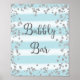 Plakatdruck für Bubbly Bar Hochzeitsschild mit Imitaten silber Glitzer Design und hellblau Streifen Aquarell Hintergrund.