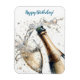 Ein wunderschön illustriertes Bild einer Champagnerflasche, die in ein Kristallglas gegossen wird. Der Champagner ist bläserig und die Glitzern im Licht, mit Tröpfchen von Flüssigkeit, die herumschwirren, schaffen eine dynamische und fröhliche Atmosphäre.