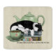 Eine niedliche, schwarz-weiße Tuxedo-Katze, die auf einem Stapel Bücher schläft, mit einer grünen Teekanne dahinter und einer Tasse Tee davor.