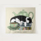 Eine niedliche, schwarz-weiße Tuxedo-Katze, die auf einem Stapel Bücher schläft, hinter der sich eine grüne Teekanne und vorne eine Tasse Tee befindet