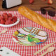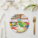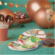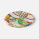 Ein grüner Bücherwurm im Stil eines Cartoon in einem Klassenzimmer. Dieses Design sieht wirklich effektiv aus bei diesen Paper-Tellern