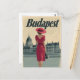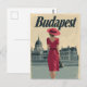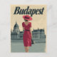 Diese romantische Vintage Postkarte zeigt die Pracht des Budapester Gebäude mit einer stilvollen Frau in einem fließenden roten Kleid aus den 50er Jahren, das im Vordergrund stehend ist. Set entlang der Donau, ist die Szene in sanften, nostalgischen Tönen gebadet, die den Charme der europäischen Reise aus der Mitte des Jahrhunderts wecken. Ein perfektes Stück für Liebhaber Vintager Mode, Architektur und klassischer Postkartenkunst.