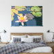 Eine zarte, rosa Wasserlilie mit einem hellgelben Zentrum schwimmt ruhig auf einem dunkelblauen Teich. Die Blütenblätter sind unzerfurcht und zeigen ihre Schönheit. Die Lilie ist von mehreren großen, grünen Lilienpolstern umgeben, von denen einige teilweise unter Wasser liegen. Die Wasseroberfläche reflektiert das sanfte Licht und schafft eine ruhige und ruhige Atmosphäre. Ein Buddha-Zitat ist in hellgelber Farbe auf der oberen rechten Ecke eingetragen.