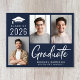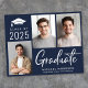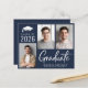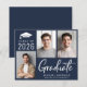 Moderne, dunkelmarineblau-blaue, preisgünstige Abschluss-Ankündigung mit 3 Fotos und "Graduate" in einer kühlen, zeitgenössischen weißen Schrift. Fügen Sie den Namen, das Unterrichtsjahr und die Schule oder Universität in einfachen weißen Typografie.