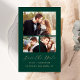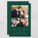 Diese schlichte, minimalistische Save the Date Karte verfügt über eine 3-Foto-Collage mit einem horizontalen Foto oben und zwei quadratischen Fotos unten. Die Worte "Save the Date" erscheinen in elegantem, goldfarbenem Handschriftenschreiben, gefolgt von den Namen des Paares, dem Hochzeitstag und der Stadt in Sans Serif Schriftart auf einem smaragdgrünen Hintergrund. Fügen Sie eine detailliertere Nachricht mit zusätzlichen Informationen auf der Rückseite hinzu.