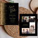 Die links Hand dieses eleganten, modernen Hochzeitsgeschehens bewahrt die Dattelkarte mit einem goldenen Imitat Glitzer Rand. Der anpassbare Text kombiniert goldfarbene Handschrift, Copperplate und kursiv Schriftart auf schwarzem Hintergrund. Die Rückseite bietet Platz für 4 Fotos (1 Quadrat, 2 horizontale, 1 lange vertikale) und Platz für Ihre Hochzeitswebsite URL oder andere Informationen.