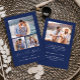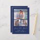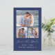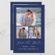 Diese schlichte, minimalistische Save the Date Karte verfügt über eine 3-Foto-Collage mit einem horizontalen Foto oben und zwei quadratischen Fotos unten. Die Worte "Save the Date" erscheinen in eleganter weißer Handschrift, gefolgt von den Namen der Paare, Hochzeitstag und Stadt in sans serif Schriftart auf marinebasischem Hintergrund. Fügen Sie der Rückseite ein viertes, horizontales Foto hinzu, zusammen mit einer detaillierteren Meldung mit zusätzlichen Informationen.