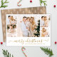 Budget Elegante Kalligrafie Script 5 Foto Collage Weihnachtszeitung Flyer. Dieser festliche, minimalistische Flyer bietet eine hübsche 5 (5) Foto Collage und sagt "Frohe Weihnachten"! Der "Frohe Weihnachten"-Grußtext ist in einer schönen Hand geschrieben, Wirble Swash-Schwanz-Schriftart-Typ in Gold und Weiß. Auf der Rückseite gezeichnete Pinienwalddoodle-Muster. Hübsche Grußkarte für Ihre Familie und Freunde in der Winterferienzeit.