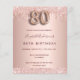 Eine moderne, stilvolle und glamouröse Einladung zu einer 80. Geburtstagsfeier. Eine Rose goldener Hintergrund mit Imitate Glitzer Tropfen. Der Name ist mit einer modernen dunklen Rose goldfarbenen Handschrift geschrieben, die als Stilschrift dient. Personalisieren Sie Ihre Party-Daten und fügen Sie sie hinzu. Nummer 80 wird mit einem Schriftart im Ballonstil geschrieben, Skript.