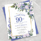 Ehre eine besondere Frau mit dieser eleganten und weiblichen Budget 90. Geburtstag Überraschung Party Einladung. Überraschung und 90. sind in großem blauen Text geschrieben. Die Geburtstagsfeier folgt. Der Name des geehrten Gastes ist auch in blauen Hauptstädte zu finden. Die Details der Geburtstagsfeier sind von einem schicken goldenen Rahmen umgeben. Die blauen Blumen und die weißen Rosen sind in tiefgrüne Blätter eingebettet.