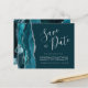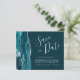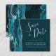 Diese elegante Save the Date-Karte verfügt über eine aquamarine blaue Aquarellgrenz mit Imitaten silbernen Glitzer bestickt. Der anpassbare Text kombiniert silbergraue Handschrift, Copperplate und kursiv Schriftart auf einem dunklen aquamarinen Hintergrund. Auf der Rückseite ist ein aquamarines und silberfarbenes Design erkennbar.