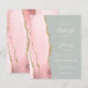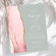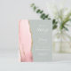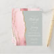 Die links Kulisse dieser modernen Hochzeitseinladung besticht durch eine rosa Wasserfarbe, die durch einen vergoldeten Imitat-Glitzer bestickt wird. Der anpassbare Text kombiniert weiße Handschrift, Copperplate und kursiv Schriftart auf einem blassgrünen Hintergrund. Auf der Rückseite ist ein passendes Rose- und Gold-Agate-Design zu sehen.
