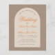 Eine moderne Hochzeitseinladung mit neutralen Erdtönen. Es hat einen Bogen mit Text darin. Das Wort Hochzeit und die Namen sind in einem orangen, eleganten Kalligraphieskript geschrieben, die Erholung des Textes ist braun, die erste Zeile ist Bogentext.