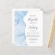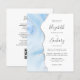 Die links Seite dieses eleganten, modernen Hochzeitseinladens besticht durch einen pastellblauen Aquarellrand, der mit Imitaten aus silberfarbenem Glitzer bestickt ist. Der anpassbare Text kombiniert Handschrift, Copperplate und kursiv Schriftart in Holzkohlegrau auf weißem Hintergrund. Die Rückseite bietet Platz für Hochzeitsdetails auf einem soliden, weißen Hintergrund, zusammen mit einem QR-Code können Gäste scannen, um Ihre Website und UAWG.