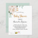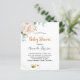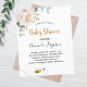 Für eine Babydusche, Feiern eines kleinen Mädchens. Ein schick weißer Hintergrund. Die Einrichtung besteht aus weißer, wasserfarbener Torone, Blume, blühender und grüner Eukalyptusgrün, Blätter, einem goldenen Gewürz und einer niedlichen, glücklichen Biene, die einen Umschlag trägt. Personalisieren und fügen Sie einen Namen und Party-Details hinzu. Schwarze und goldene Buchstaben. Der Text: Baby Shower und der Name der Mutter zu sein geschrieben werden mit einem modernen handgeschriebenen Stil Skript. Zurück: grüne Hintergrundfarbe und die glückliche lächelnde Biene.