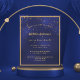 Eine trendige, moderne 50. Geburtstagskarte für Männer, Typ und Männer. Ein dunkelblauer, marineblauer Hintergrund. Die blaue Farbe ist ungleichmäßig. Mit einem goldenen Rahmen und goldenen Konfetti-Imitat sprinkle, goldfarbene Buchstaben. Personalisieren Sie Ihre Party-Informationen und fügen Sie sie hinzu. Zurück: blauer Hintergrund mit Konfetti sprinkle.