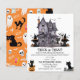 Niedlicher Trick oder Treat Invitation für die ganze Familie inklusive einem Halloween-Party mit Spuk Haus und schwarzen Katzen Illustration. Sie können diese Einladung mit Ihren Daten personalisieren.