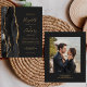 Die links Seite dieses eleganten, modernen Hochzeitseinladens besticht durch einen schwarzen Aquarellrahmen, der mit vergoldetem Imitat bestickt ist. Der anpassbare Text kombiniert goldfarbene Handschrift, Copperplate und kursiv Schriftart auf einem schwarzen Hintergrund. Ersetzen Sie das Beispielbild auf der Rückseite einfach durch Ihr eigenes vertikales Foto, und fügen Sie eine kurze Nachricht mit zusätzlichen Informationen, wie z.B. Ihre Hochzeitswebsite-URL, hinzu. HINWEIS: Umschläge sind nicht automatisch in diese Einladungen mit dem Budget eingeschlossen. Bitte denken Sie daran, die Option "weiße Umschläge" zu wählen!