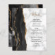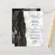 Die links Seite dieses eleganten, modernen Hochzeitsmenüs besticht durch einen schwarzen Aquarellrahmen, der mit vergoldetem Imitat-Glitzer besticht. Der anpassbare Text kombiniert schwarz-goldfarbene Handschriftenschrift mit Copperplate-Schriftart auf grauem und weißem Marmorhintergrund. Auf der Rückseite ist ein passendes schwarz-goldfarbenes Agerat-Design zu sehen.
