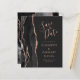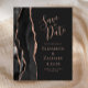 Der links Rand dieser eleganten modernen Hochzeit speichern Sie die Dattelkarte mit einem schwarzen Aquarellrahmen in Aquarellfarbe bestickt mit Imitate Rose Gold Glitzer. Der individuell anpassbare Text kombiniert Handschrift, Copperplate und kursiv auf dunkelkohlegrauem Hintergrund. Auf der Rückseite ist ein passendes goldenes Design in Schwarz und Rose.