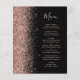 Die links Seite dieses eleganten, modernen Hochzeitsmenüs besticht durch eine Rose mit goldenen Imitaten Glitzer. Der anpassbare Text kombiniert Rose pink whimsical Handschrift Skript und Copperplate Schriftart auf einem schwarzen Hintergrund. Auf der Rückseite ist ein Schwarz-Rose-Gold-Glitzer-Design in passender Form erhältlich.