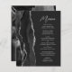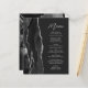 Die links Seite dieses eleganten, modernen Hochzeitsmenüs besticht durch ein schwarzes Aquarelldesign, das mit Imitaten aus silberfarbenem Glitzer besticht. Der anpassbare Text kombiniert silbergraues Handschriftenskript und singt Serif-Schriftart auf schwarzem Hintergrund. Das schwarz-silberne Age-Design wird auf der Rückseite wiederholt.
