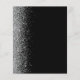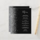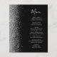 Die links Kulisse dieses eleganten, modernen Hochzeitsmenüs besticht durch einen silbernen Glitzer-Rahmen mit Imitaten. Der anpassbare Text kombiniert silbergraue Handschrift-Skripte mit Copperplate-Schriftart auf schwarzem Hintergrund. Die Rückseite ist in Schwarz und Silber gehalten.